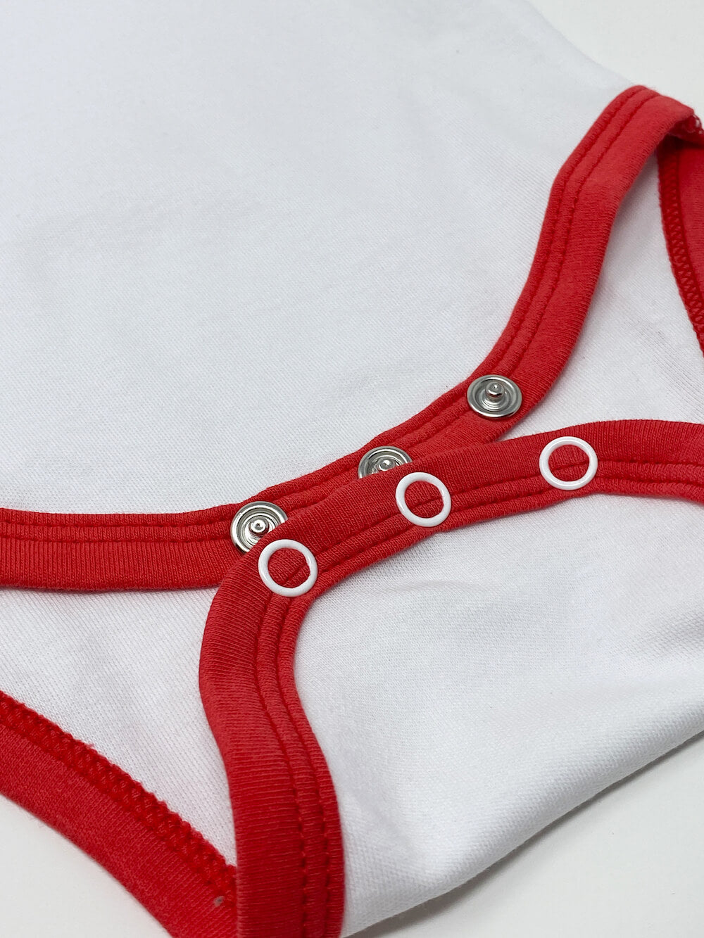 Keep your little one cute and cozy in our Perry the Pig bodysuit, featuring soft red trim and our logo beside a graphic of Perry the Pig enjoying some apples.